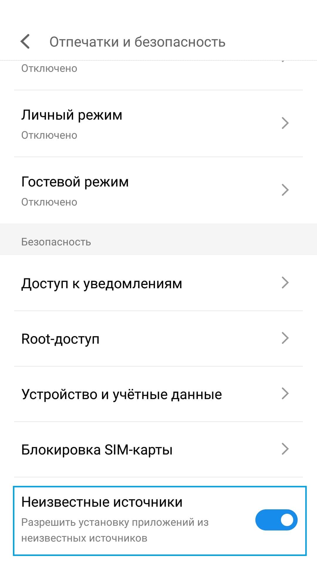 Затем выберите пункт "Безопасность" и разрешите установку программ из сторонних и неизвестных источников: