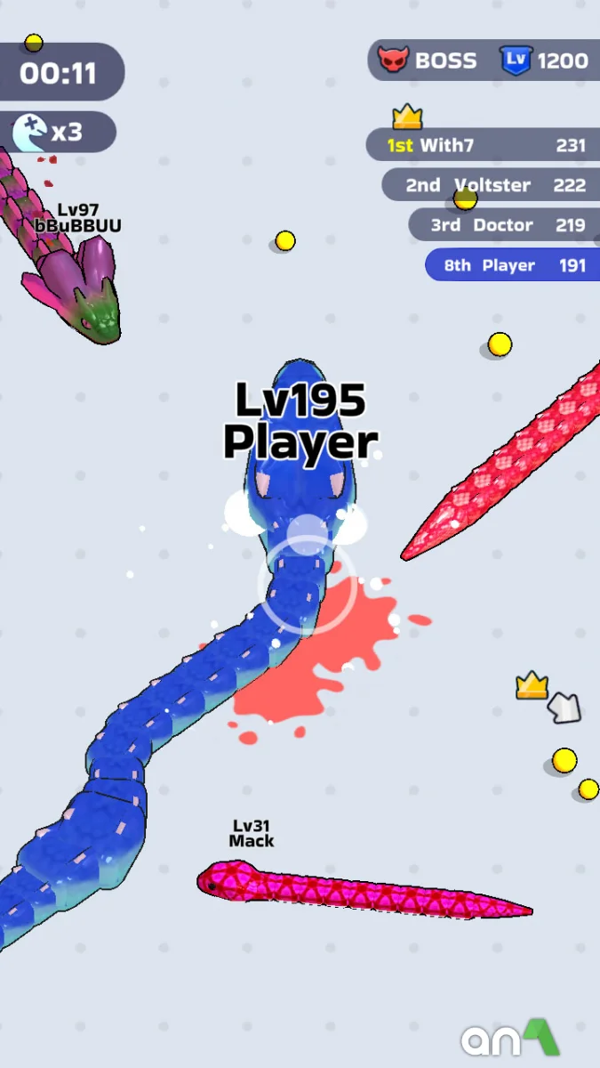 Snake Clash (MOD, Unlimited Money) - is not just another clone of the classic snake, but a dynamic action game where you have to survive, fight and evolve in a world full of dangerous opponents. Start as a small snake, devour prey, devour weak opponents and gradually transform into a huge and unstoppable predator that dominates the arena. Your task is to become the strongest snake by avoiding traps and fights with bigger opponents, but don't forget that every mistake can be fatal. Each level offers fights with unique bosses. Snake Clash combines classic snake gameplay with modern mechanics, adding dynamics, strategy and battle elements.