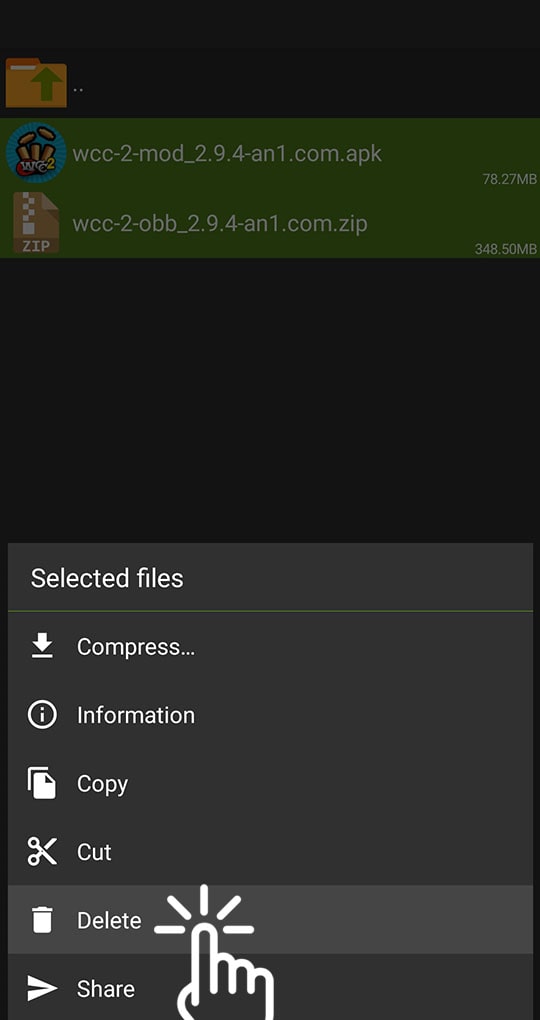 5) To save space, go back to the folder "Download", highlight the two files (APK and ZIP) of the game you installed, and open the list of commands, where you have to choose "Delete":