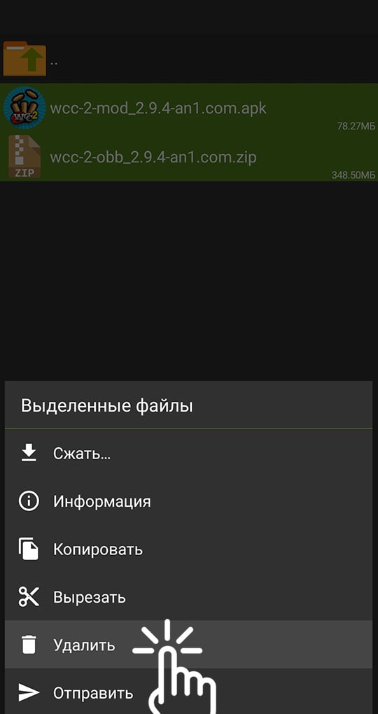 5) Чтобы не занимать лишнее место, вернитесь в папку "Download", выделите 2 файла (APK и ZIP) игры которую Вы установили, и откройте список с командами, где вам нужно выбрать "Удалить":