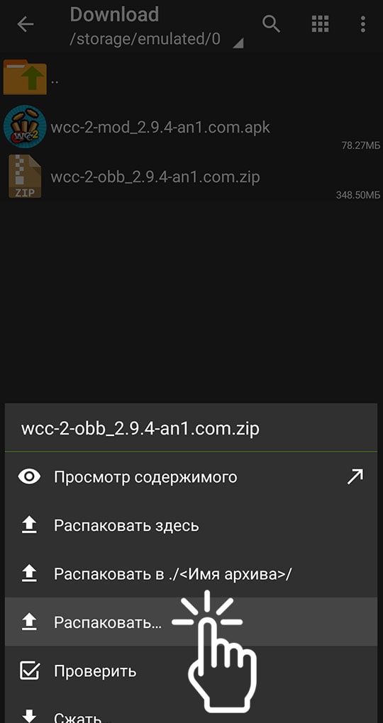 4) Нажмите на .ZIP (OBB) архив игры, после чего у Вас появиться список в котором нужно выбрать "Распаковать..."